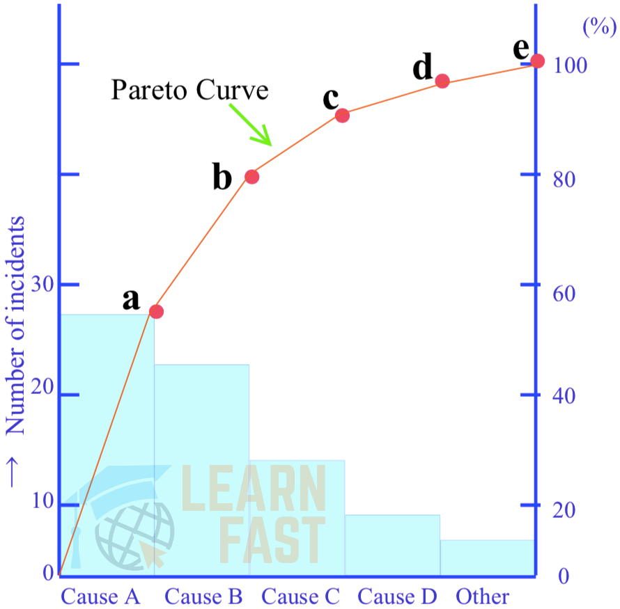 A Pareto diagram is a kind of frequency distribution graph. Imagine a set of data relating to equipment failures, rework, errors, complaints and other losses. The data specifies the financial cost of each loss, how often it occurs, what percentage of the total loss it accounts for, and so on. The losses may also be classified by their causes or the situations in which they appear. If this data is represented as a bar chart with the values in descending order, it will be obvious at a glance which category has the most failures, defects, etc. Plotting the cumulative total for each category on the resulting histogram will produce a Pareto diagram, as shown in the image. A Pareto diagram enables causes to be ranked and thus prioritized and tackled more effectively.